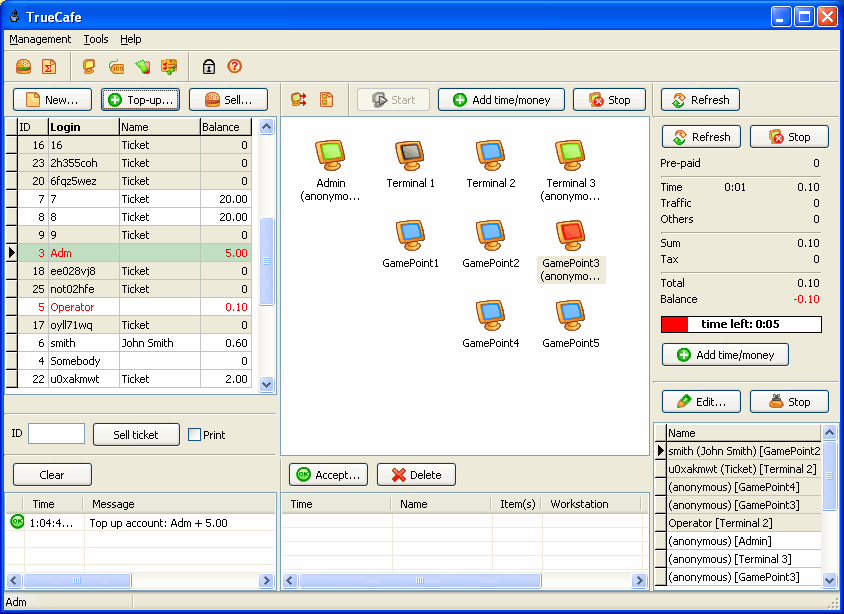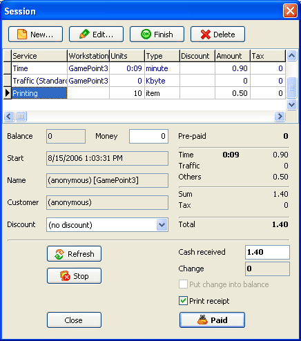 All important information is displayed on one screen: the list of customers that you can create, edit, sell products to; the list/icons of workstaions you can arrange according to the real location of terminals in the club; session summary for a selected terminal; the list of active sessions. While managing a session, you can set/extend a time limit or pre-paid, add any product (printing, scanning, etc.), give a discount, print a receipt when a session is finished. |