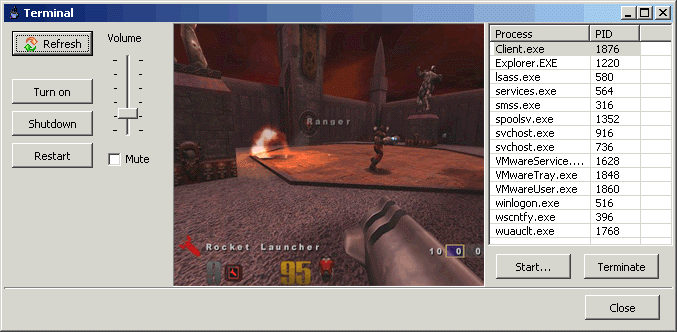 Get a terminal screenshot and the list of running processes. Terminate any process, start an application remotely. Control terminal sound volume, mute sound. |