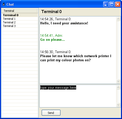 Use a build-in instant messenger to organize a chat between operator and a customer on any terminal. Send a text message to a terminal in order to notify your customers about an important event or provide them with any other information. |