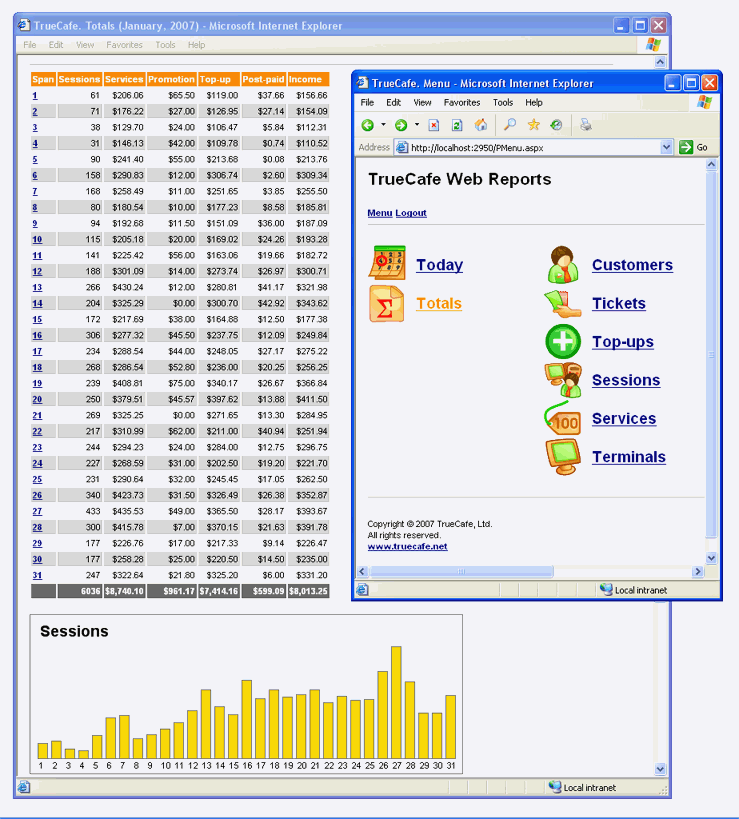 Analyze your business data in your web browser. Get access to your cyber cafe activity information outside the cafe from the Internet. Browse session, customer, service, terminal, etc. data for any period of time. View the diagrams which represent your business growth. Print any report on your printer for further analisis. |