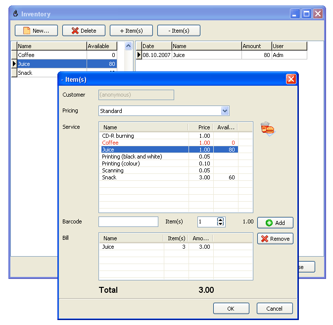 Control available amount of your items in the stock. Use your barcode scanner when you sell the items. |