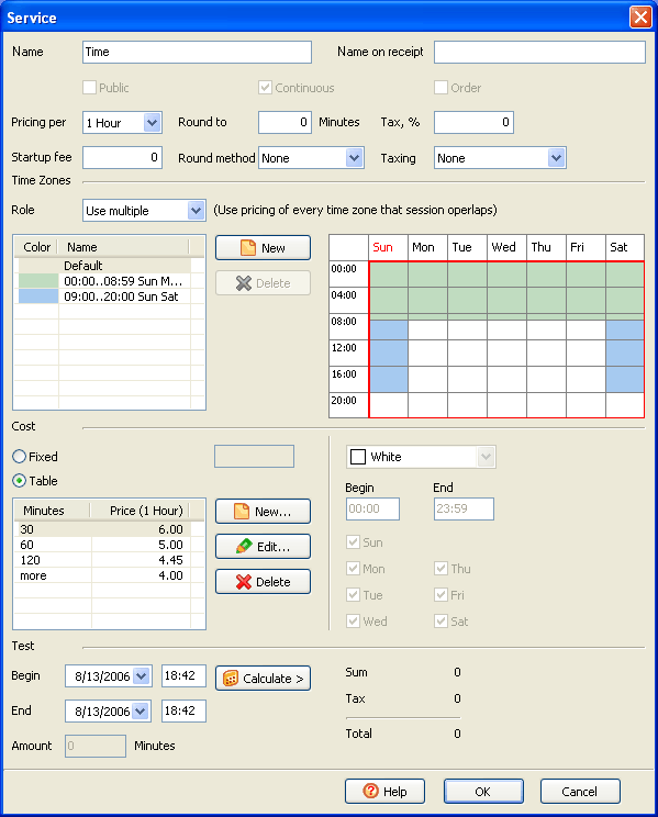 Configure pricing per minute, hour, an item or setup a table of fixed sums that are added to a bill; round amount of a service; setup taxing (included in or excluded of the price). Create a number of time zones with distinct pricing for each one. Setup amount-dependent pricing (e.g. 1 hour = $5, 2 hours = $7, etc.). Create a pricing package for each group of customers or let your customer select pricing they prefer by providing them with "public" packages. |