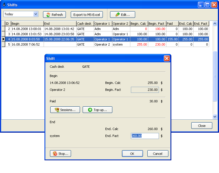 Control your operators and cash flow using the shift management feature. Every operator computer is considered as a cash desk so that each shift is linked to the corresponding cash desk. When an operator starts working with the program collecting any payment, starting/stopping customer sessions, etc., he has to start a shift. When he finishes working with the software, he stops his shift. |