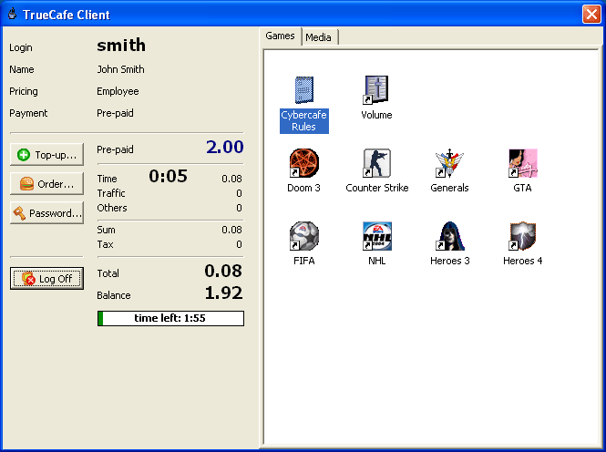 Lock a terminal unless a customer enters his name/password or a cyber cafe administrator unlocks a terminal remotely. Disable the Task Manager, hide the standard Desktop and Start Menu. Setup a restricted set of applications a user can start. Warn a customer via a message or custom sound file when critical amount of time/money is left. Let your customer top-up his balance using a ticket, change his password, order products (drinks, snacks, etc.) from his/her place. Restart a terminal when a session ends to rollback any changes made by a customer (providing that DeepFreeze software is installed). |